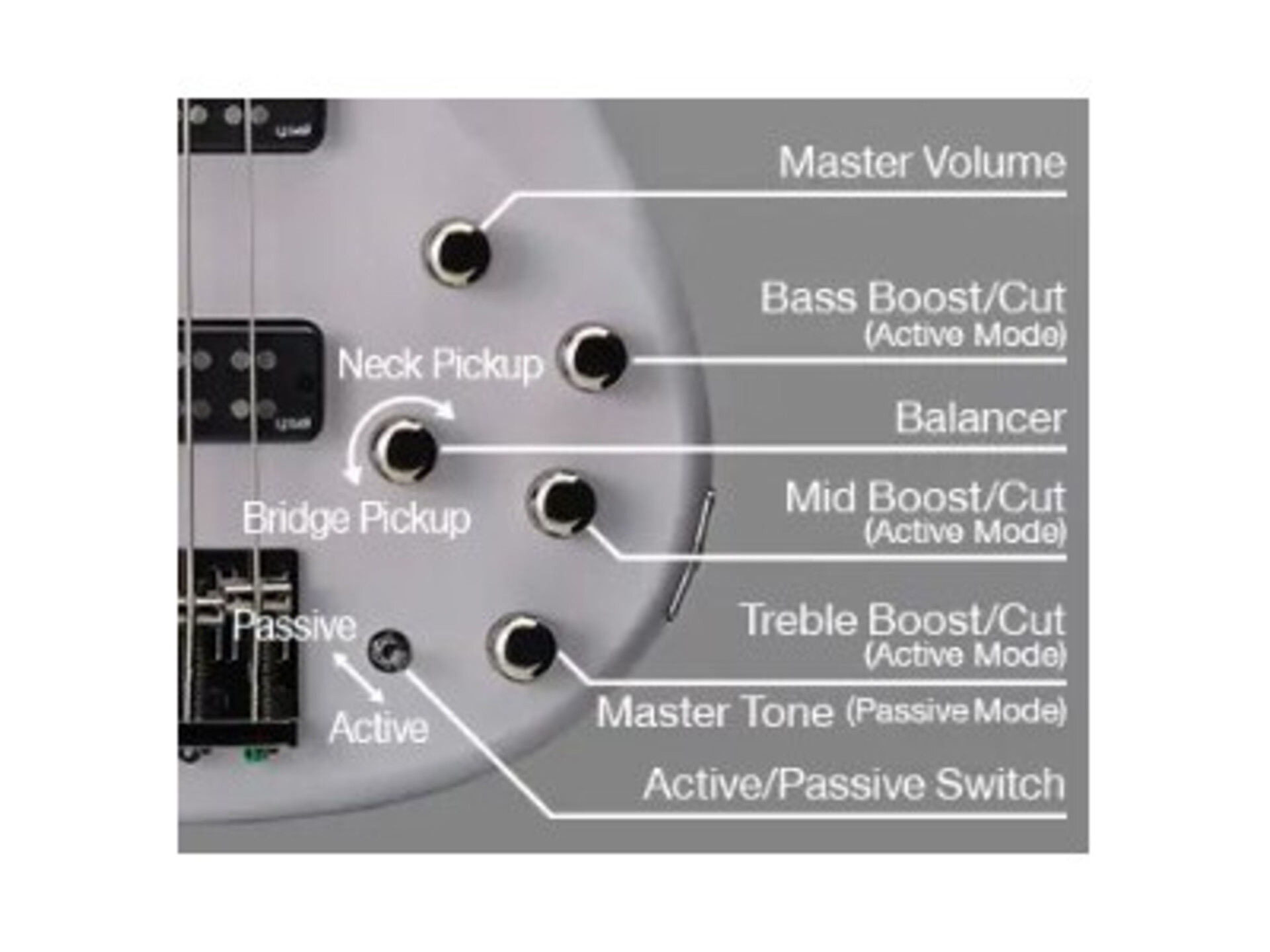 - Controlli: Volume, pickup Balancer, Bass, Treble, switch Attivo-Passivo